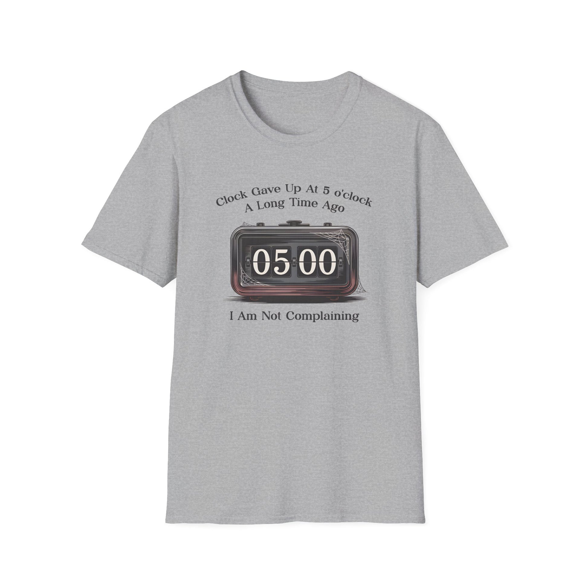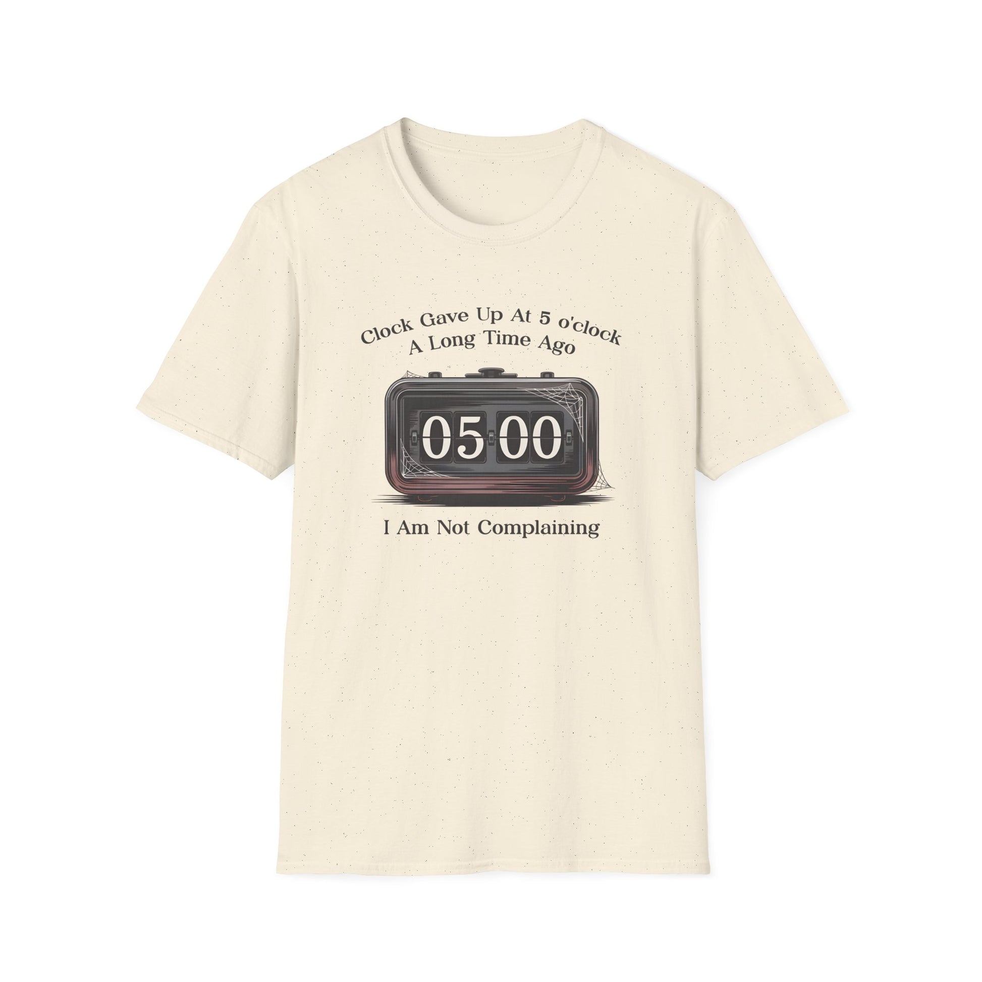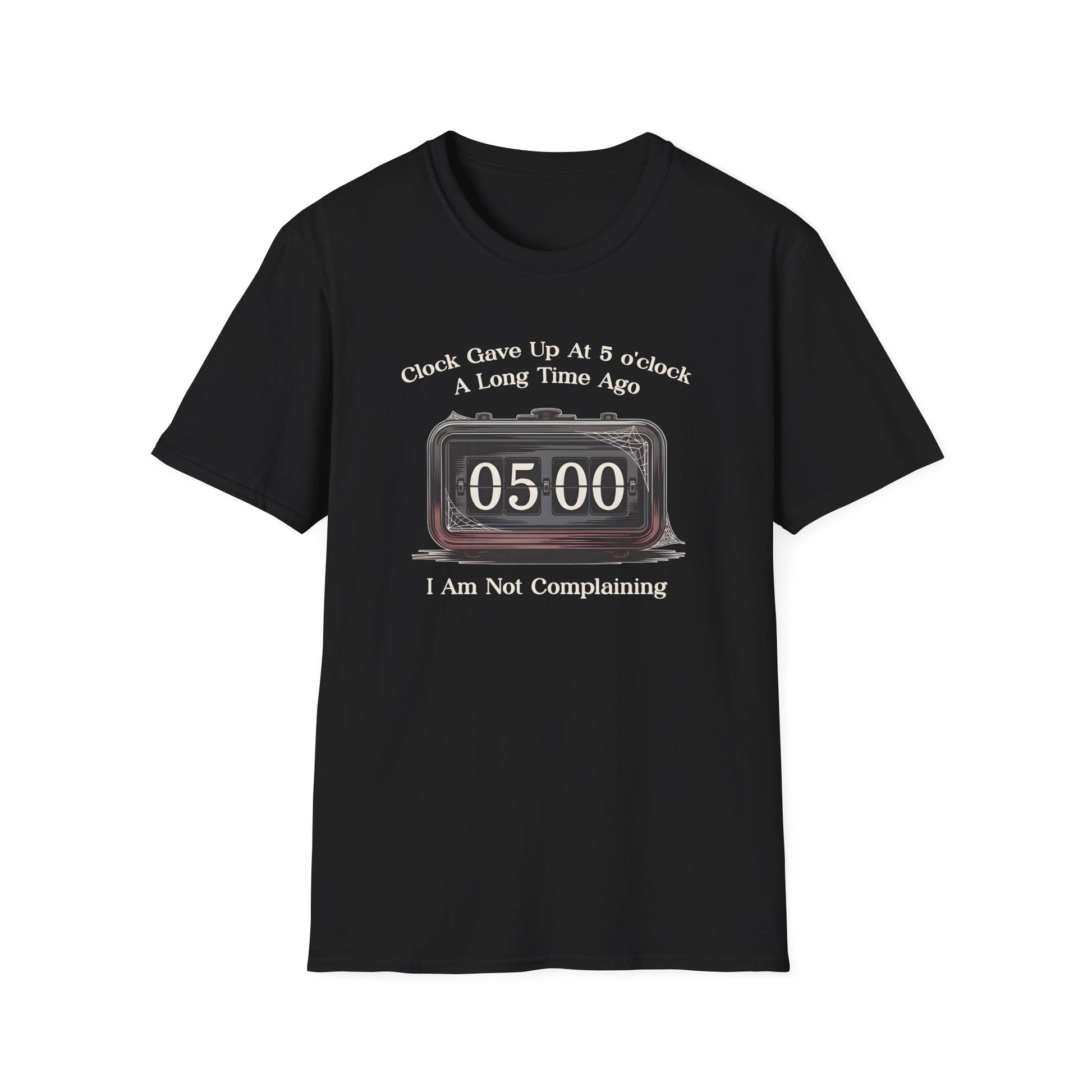 The clock quit at 5 o’clock a long time ago, and honestly… is that really a bad thing? Soft ring-spun cotton, modern classic fit, printed and shipped in the USA.