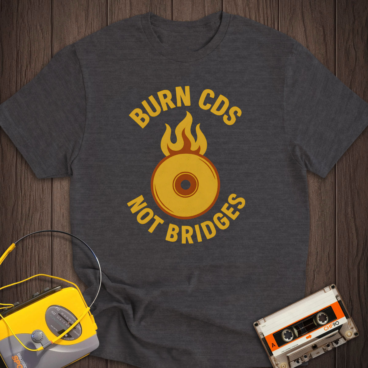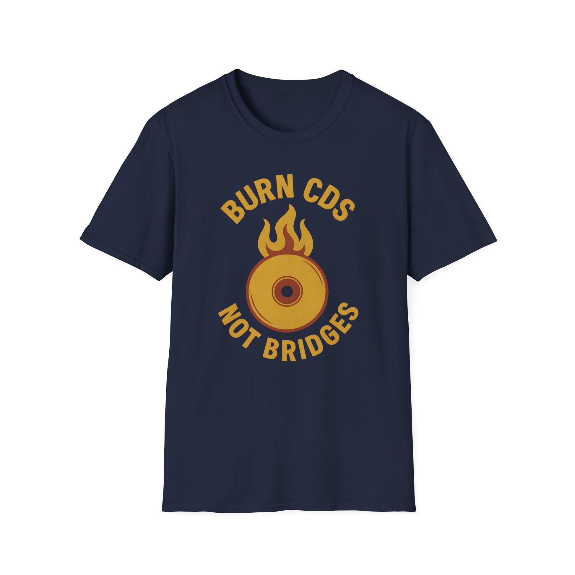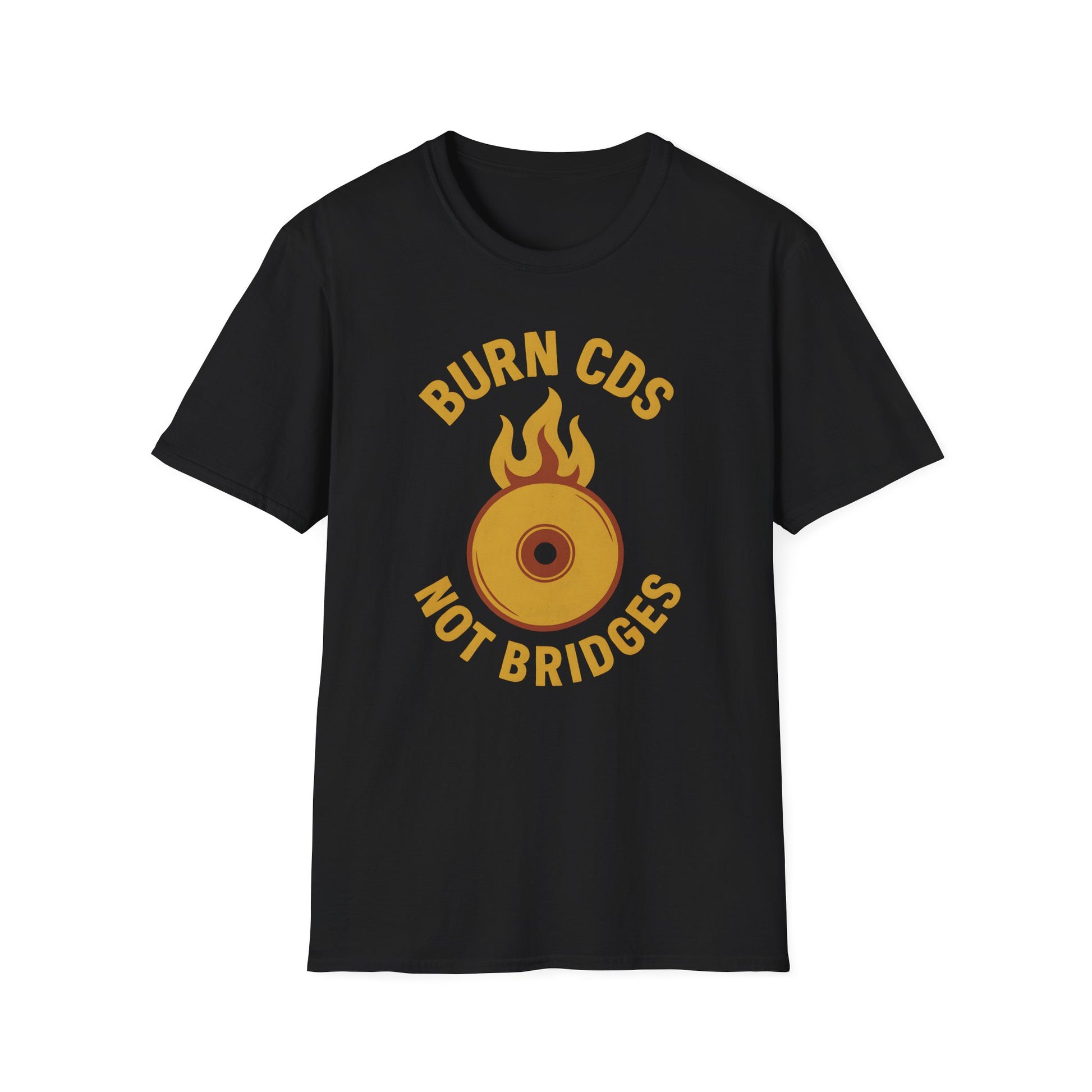 Keep your friendships intact—but your playlists on fire. The “Burn CDs Not Bridges” tee blends 90s nostalgia with a clever pun. Made from soft cotton with a true-to-size modern fit. Printed and shipped in the USA.